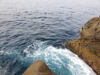 強いウネリで時折足場を波しぶきが襲う